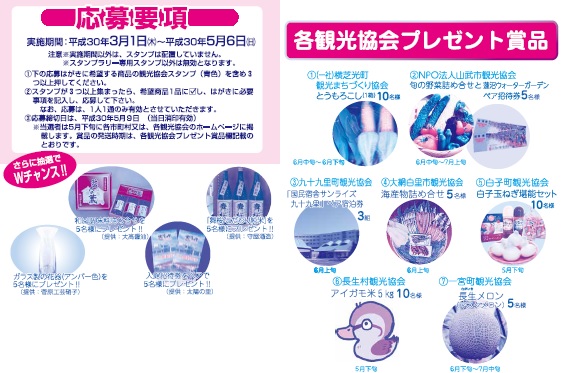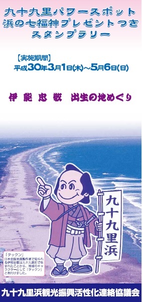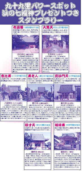 イベント情報EVENTS トップ イベント 浜の七福神プレゼントつきスタンプラリー始まります 3/1~ 浜の七福神プレゼントつきスタンプラリー始まります 3/1~ 2018.02.28 九十九里パワースポット 浜の七福神プレゼントつきスタンプラリーが始まります 実施期間 平成30年3月1日(水)~5月6日(日) 応募締切日 平成30年5月9日(水)(当日消印有効) 横芝光町の布袋尊、山武市の大黒天、九十九里町の恵比寿、大網白里市の寿老人、白子町の毘沙門天、長生村の辨財天、 一宮町の福禄寿の七福神をめぐるスタンプラリーです 希望するプレゼントの観光協会を含め、3つ以上のスタンプを集めてご応募ください